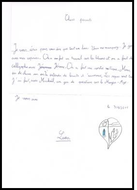 Trong thư con kể con khỏe, nhớ ba mẹ, thức ăn ngon. Con chơi nhiều trò chơi với các bạn cùng lớp, đi dạo trong rừng ban đêm để nghe tiếng kêu của động vật. Con vẽ trái tim rồi có mấy cái gì tùm lum ba mẹ ngồi đoán là cây viết chì, rồi là ngọn đuốc...hihihi... đúng là rảnh quá! CL nghe mẹ đọc thư xong thì cầm lên hôn cái chụt vào chữ ký của con.